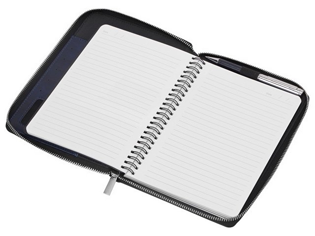 Бизнес блокнот Fabrizio состоит из пенала на молнии выполненного из искусственной кожи, и сменной тетради на 80 листов на кольцах с перфорированными линованными листами белого цвета.
